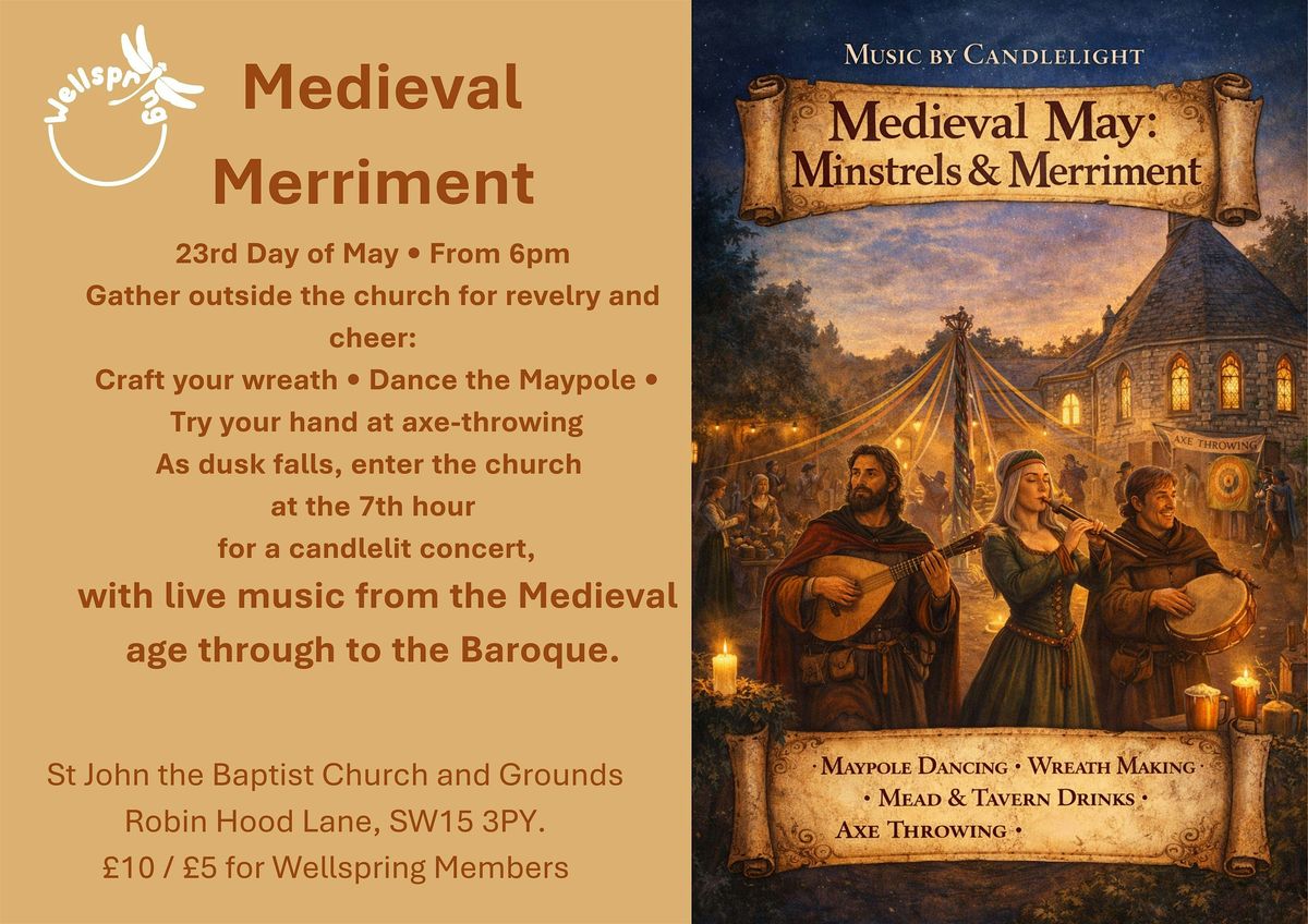 Gather outside the church for revelry and cheer: Craft your wreath • Dance the Maypole • Try your hand at axe-throwing As dusk falls, enter the church at the 7th hour for a candlelit concert, with live music from the Medieval age through to the Baroque.This event is suitable for all ages. Feel free to bring a picnic or snacks. Medieval costumes welcome but not essential.