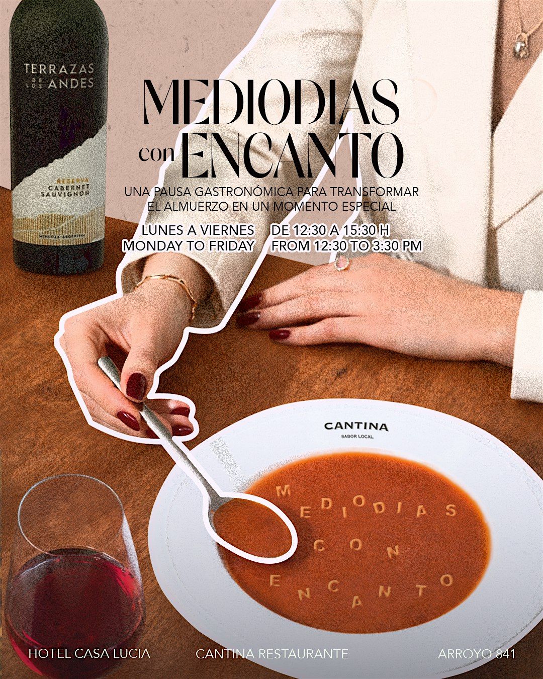 Con una propuesta que equilibra calidad, calidez y eficiencia, Mediodías con Encanto es ideal tanto para almuerzos de trabajo como para encuentros más distendidos, ofreciendo una experiencia cuidada en cada detalle, en un espacio que celebra la elegancia y el buen vivir.
