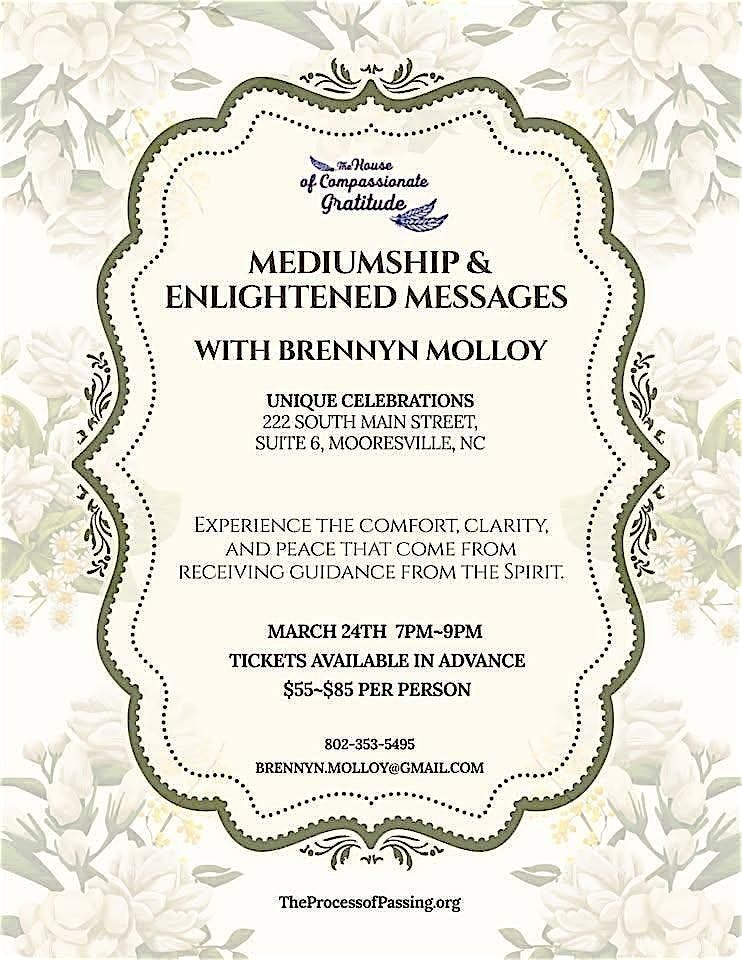 An Evening of Messages, Healing & Spirit ConnectionIf you’re drawn to powerful mediumship events and heartfelt connections with the other side, this is an evening you won’t want to miss.Join intuitive medium Brennyn Molloy for a transformative night of healing as she delivers messages from Creator God, Angels, Spirit Guides, and Loved Ones who have crossed over.Experience the comfort, clarity, and peace that come from receiving guidance from the spiritual realm. Many attendees describe these gatherings as life‑changing—filled with validation, direction, and a renewed sense of purpose.Brennyn creates a warm, supportive space where the spirit world comes alive with encouragement, insight, and divine connection. In a time of rapid change and awakening, this event offers grounding, hope, and a reminder that you are never walking your path alone.Perfect for those who love live mediumship events, spiritual messages, and deep soul connection. Ideal for anyone seeking healing, reassurance, or a sign from the other side.Reserve your seat today and be part of an unforgettable evening with the spiritual community.