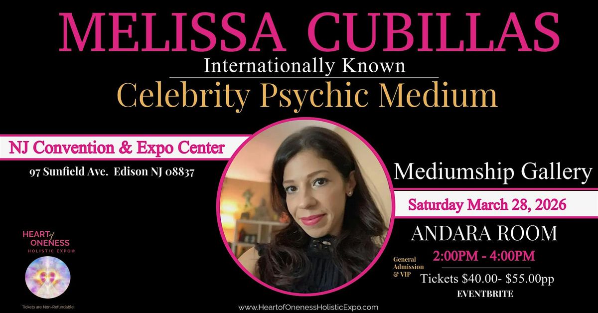Join international celebrity psychic medium Melissa Cubillas (MC) for this very special mediumship gallery, exclusively at the Heart Of Oneness Holistic Expo, on March 28th 2026. During this event Melissa will be delivering messages and connecting audience members with their loved ones in Heaven. Melissa is known for her evidential, accurate, and extraordinary ability to connect with those who have passed. Should time permit, she will also take some audience questions. Please note in previous years, this gallery event has sold out. In order to secure your tickets we highly recommended purchasing them online, in advance. Once ticket sales end online, there will be a very limited amount of tickets reserved for purchase at the door.