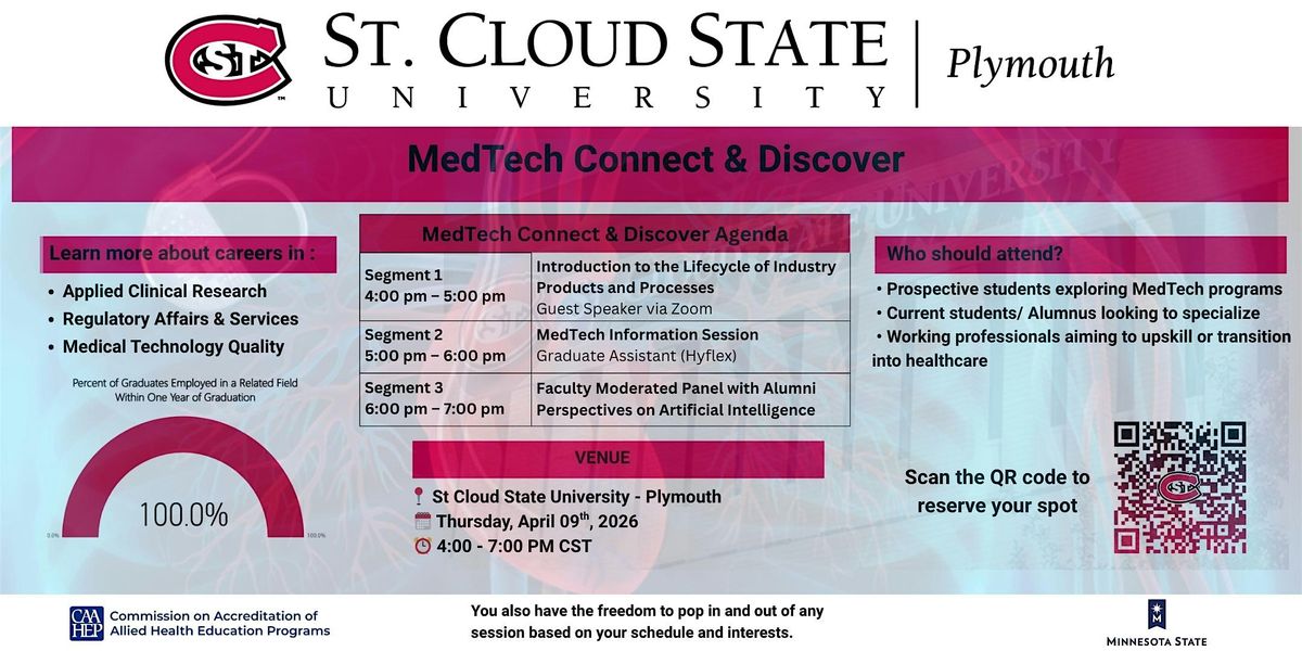 Join us or continue with us at 5:00 PM to participate in our MedTech Information Session! This is an in person as well as an online Zoom conversation with St. Cloud State University's program directors and current students. Learn specifics about MedTech academic paths available to them through the Applied Clinical Research (ACR), Medical Technology Quality (MTQ), and Regulatory Affairs and Services (RAS) programs.