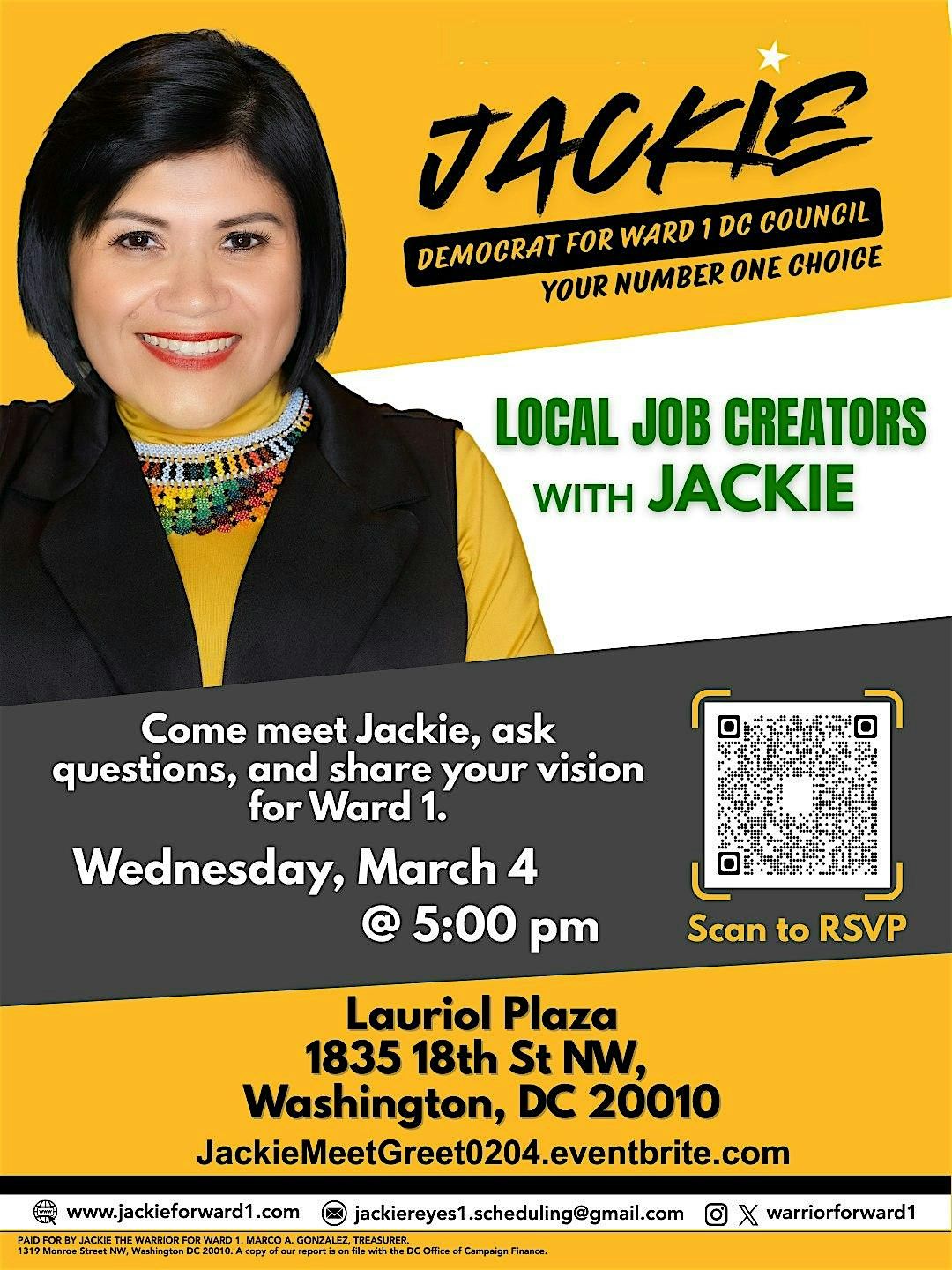Join Jackie Reyes Yanes, candidate for DC Council representing Ward 1, for an evening of conversation, connection, and community.