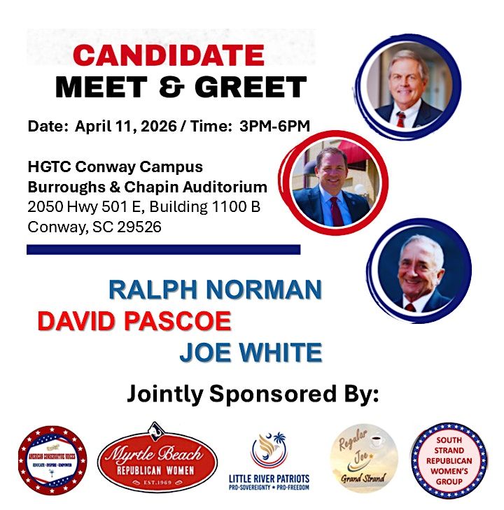 Info: Hosted by American Conservative Voices, Myrtle Beach Republican Women, Little River Patriots, Regular Joe of the Grand Strand and South Strand Republican Women's Group. Our goal is to provide you with the opportunity to choose the best candidate for YOU on June 9, 2026.