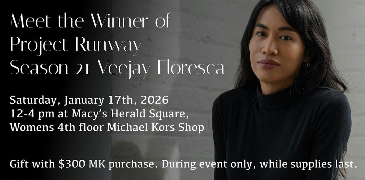 Hey fashion fans! Join us in Women's 4th Floor Michael Kors Shop in Macys Herald Square. Don't miss this unique chance to meet Veejay Floresca, the amazing winner of Season 21 of Project Runway. Get ready for an unforgettable in-person event full of style, stories, and inspiration. Come hang out, ask questions, snap some cool pics, enjoy light refreshments, and get styled. While you are here if you purchase $300 in Michael Kors, recieve a complimentary travel bag. During Event Only, While supplies last.