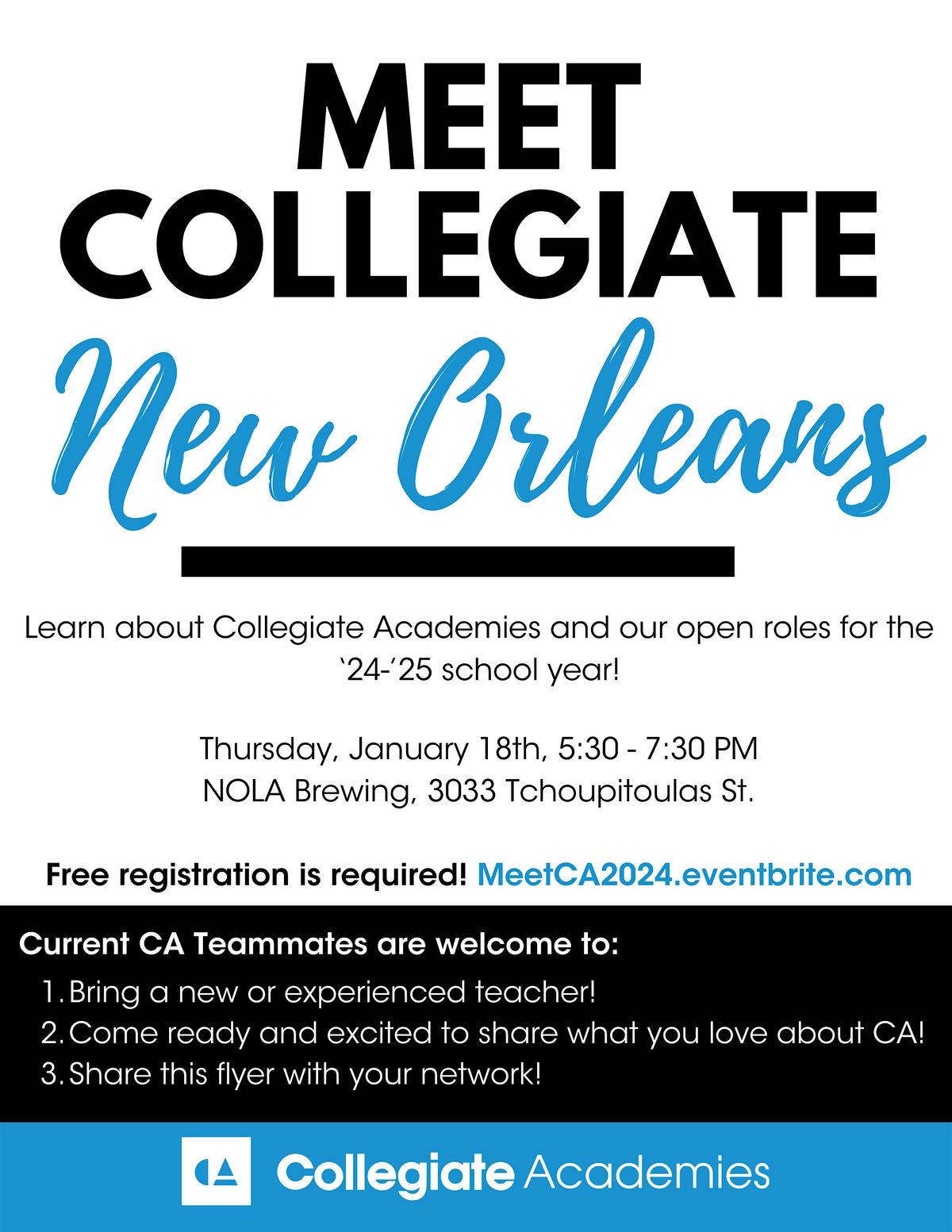 Learn about careers at Collegiate Academies, meet our staff, and enjoy some great food and drinks on us! RSVP is required for entry.