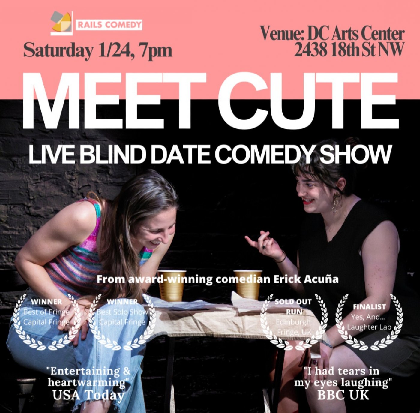 Meet Cute DC is the sold-out, award-winning live blind date comedy experience where two real singles meet on stage and DC’s funniest comedians turn their real conversation into nonstop laughs. Praised by USA Today and the BBC, this hit show blends sharp improv, genuine connection, and unexpected moments that make every night completely unique.