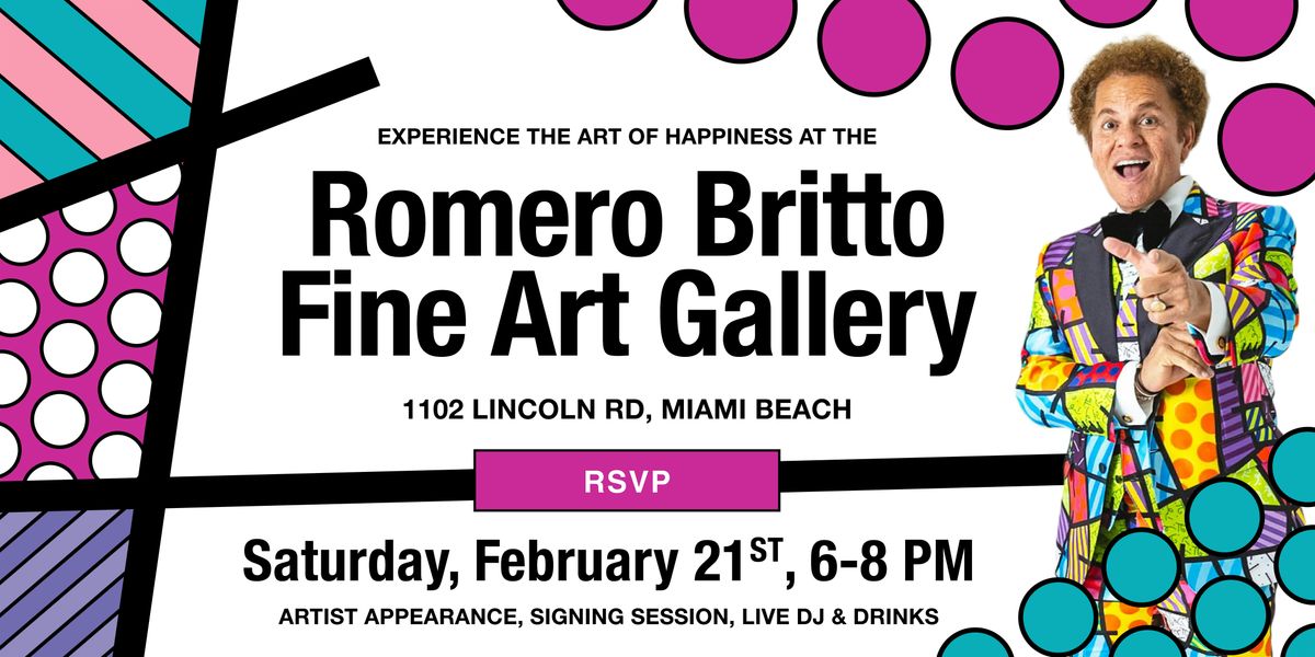 Step into the vibrant world of Romero Britto at an exclusive fine art event in Miami Beach. Join us Saturday, February 21 from 6–8 PM at the iconic Romero Britto Fine Art Gallery for an unforgettable evening celebrating color, creativity, and contemporary art.