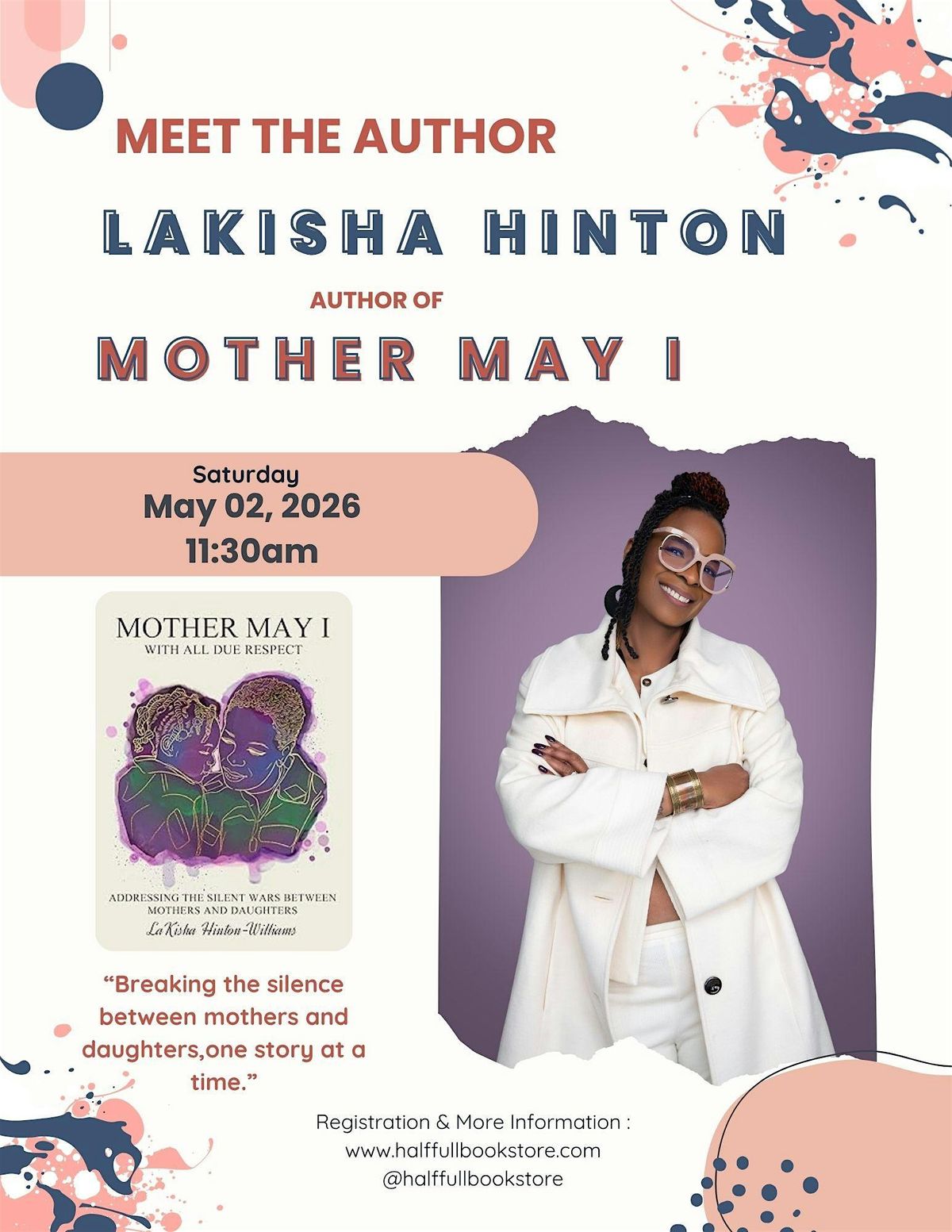 Come join us in person for an exciting chance to meet Lakisha Hinton, the brilliant mind behind Mother May I! Get ready to dive into her world, ask questions, and hear stories straight from the source. Itβs a cozy, casual vibe where book lovers and new friends come together. Donβt miss out on this fun and inspiring event!