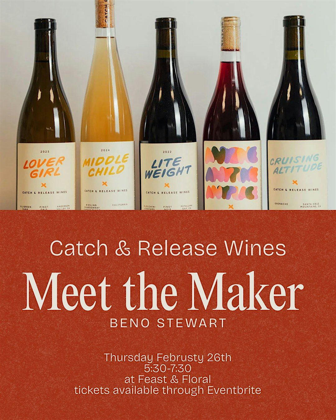 Beno Stewart from Catch & Release wines will guide you through six different wines. A sparkle, 2 whites, an orange, and 2 red wines will be served. Your own personal cheese and charcuterie board will be at your place setting to enjoy while you sample and learn. After the event all Catch & Release bottles will be available to purchase for 20% off for this day only!