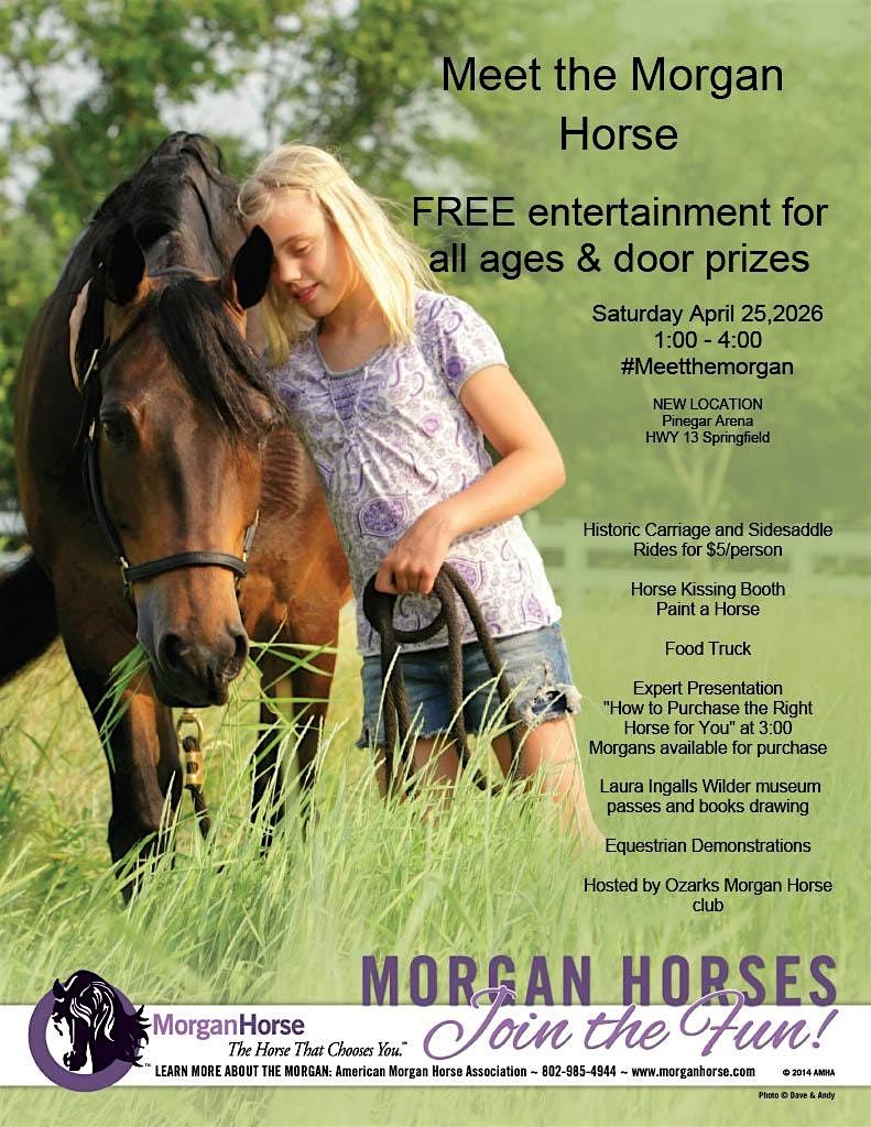 Ready for a fun day out? Come meet the Morgan Horse in person! Get up close with these friendly and beautiful horses, learn about their history, and see why they're so special. Whether you're a horse lover or just curious, this event is perfect for all ages. Don't miss out on a chance to connect with these amazing animals and enjoy some great company. See you there!
