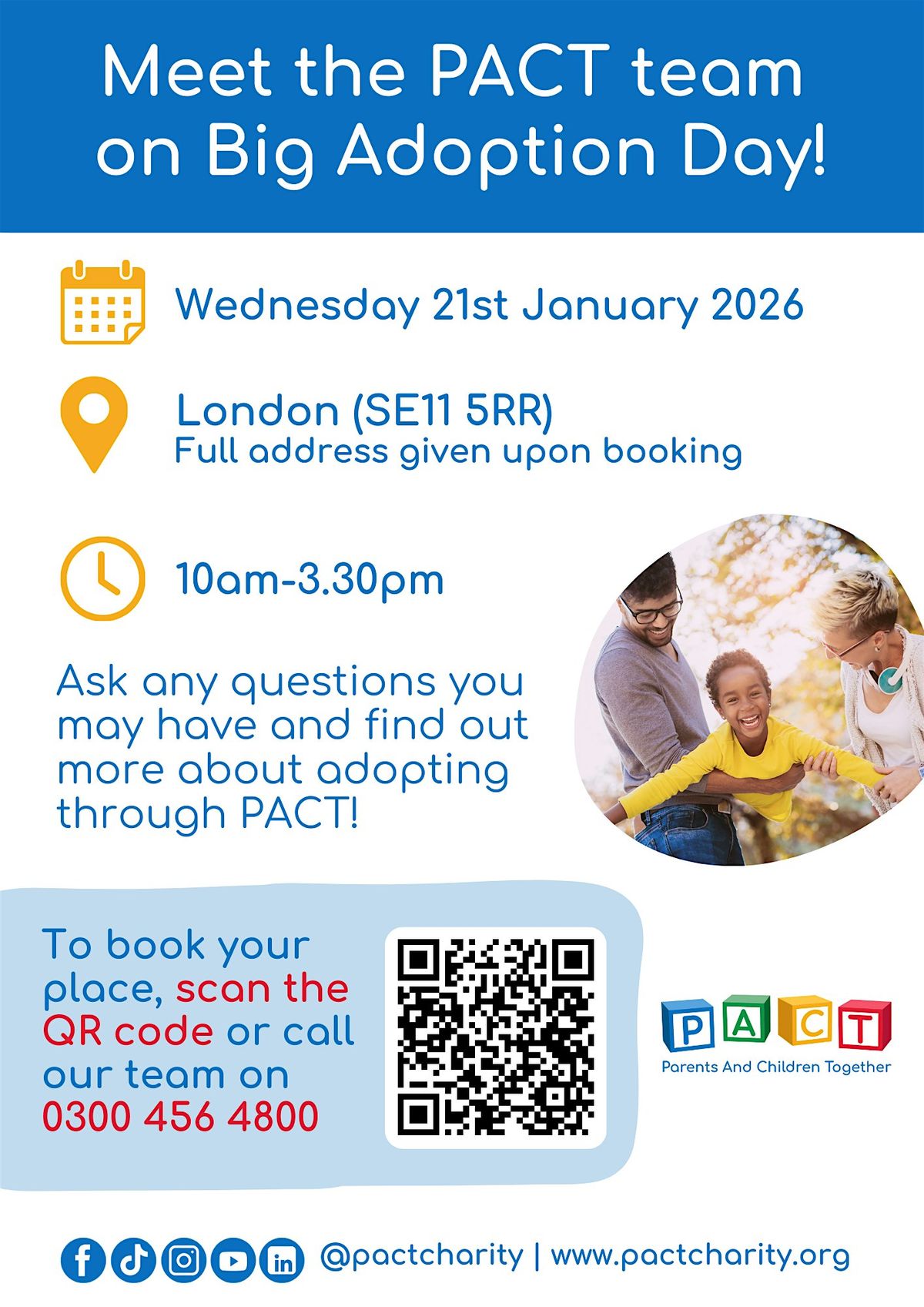 This Big Adoption Day, come along and meet the team in London (SE11 5RR). Ask any questions you may have and find out more about adopting through PACT - Parents And Children Together
