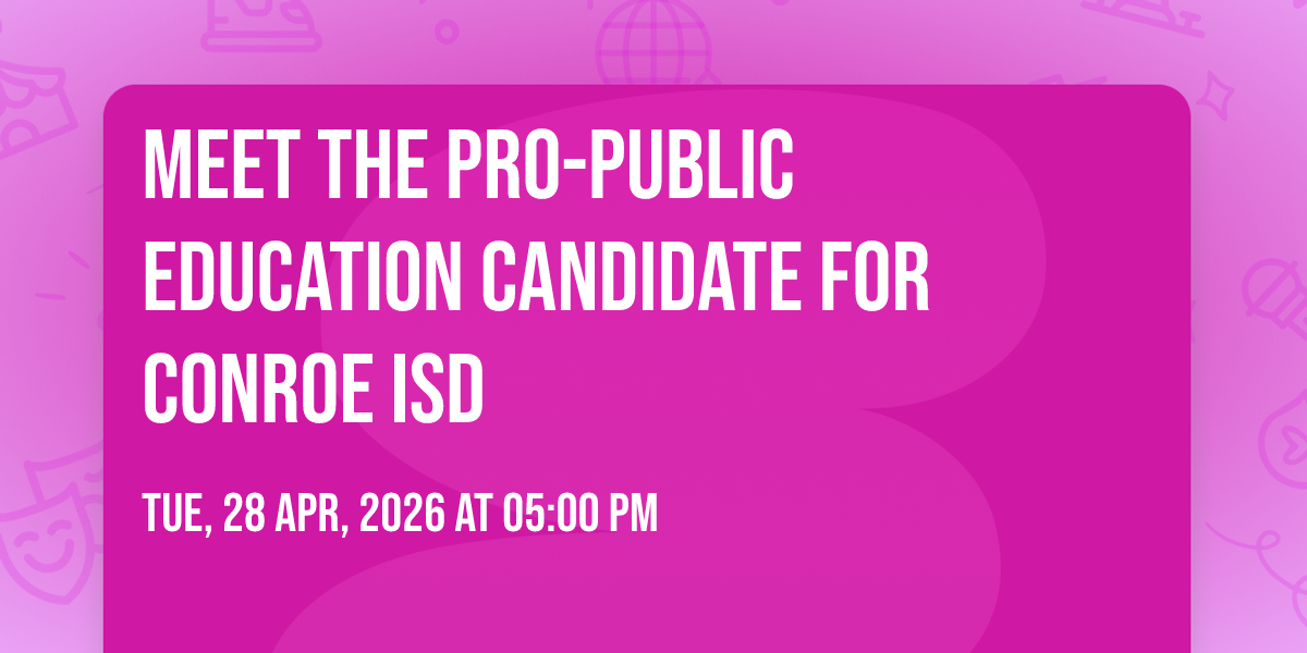 You are invited to a come-and-go reception to meet the pro-public education candidates for Conroe ISD school board, who are fighting to bring back local control to our school district. Subscribe to the newsletter to learn about more upcoming events https://lp.constantcontactpages.com/sl/FRkfgMl