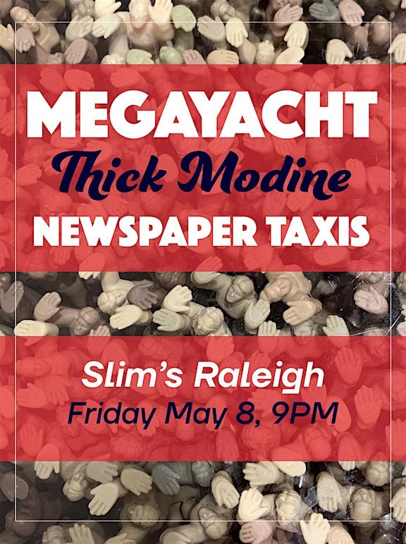Megayacht, Newspaper Taxis, and Thick Modine are rocking out at Slim’s on May 8th, 8-11pm! Megayacht is a Chapel Hill indie rock band. Newspaper Taxis bring power pop and garage rock vibes. Also joining the set is funk rock band Thick Modine!