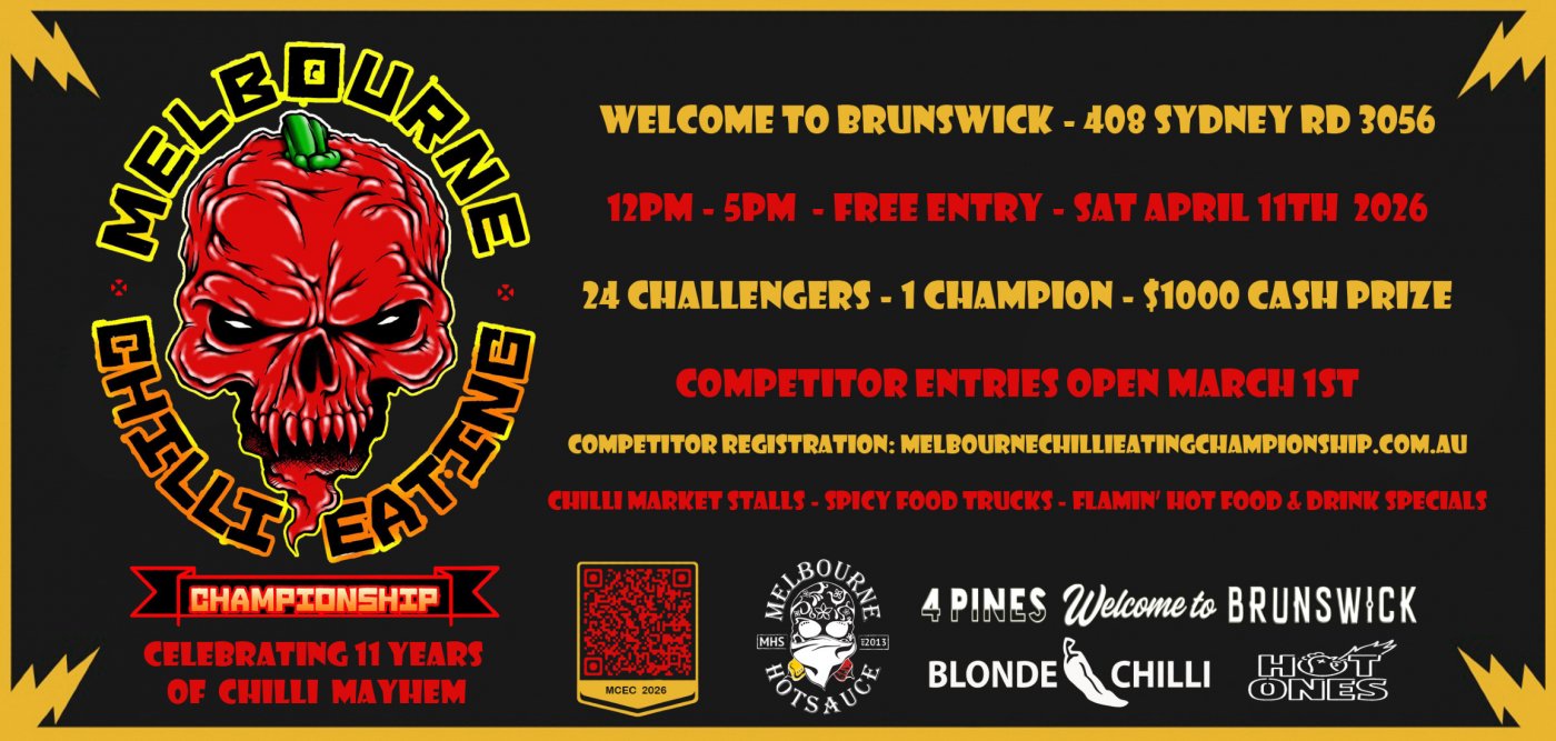 Founded in 2016 The Melbourne Chilli Eating Championship is back for 2026 bigger & better than ever before!