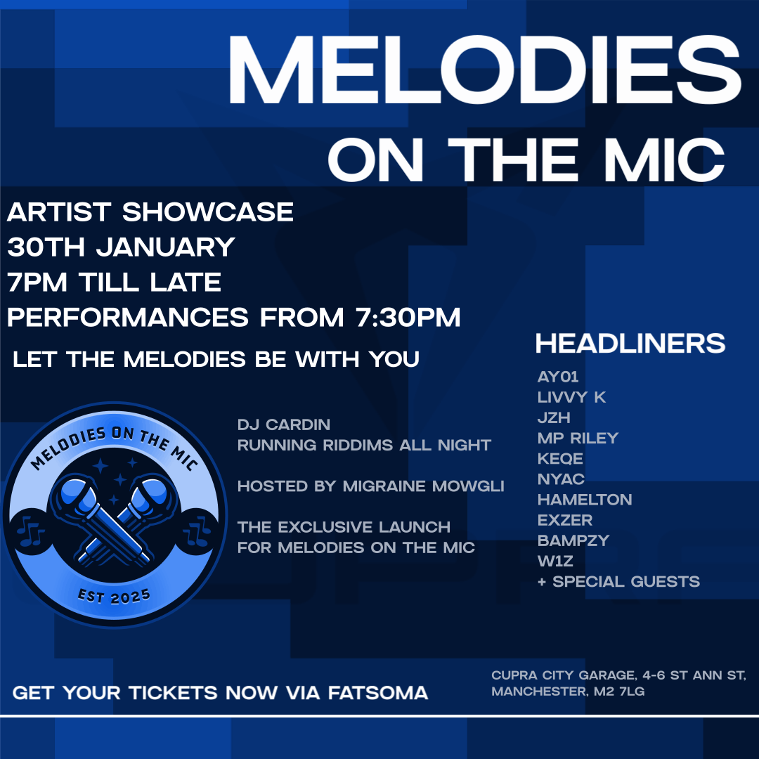 MELODIES ON THE MIC is delighted to announce the launch of its artist showcases, starting from 30th January. This is the first in a series of artist showcases nights, dedicated to promoting the best underground music and artists out of Manchester and the UK. Expect to hear sounds of UK R&B, Wave, Afro-Fusion and Alternative R&B.Disclaimer: