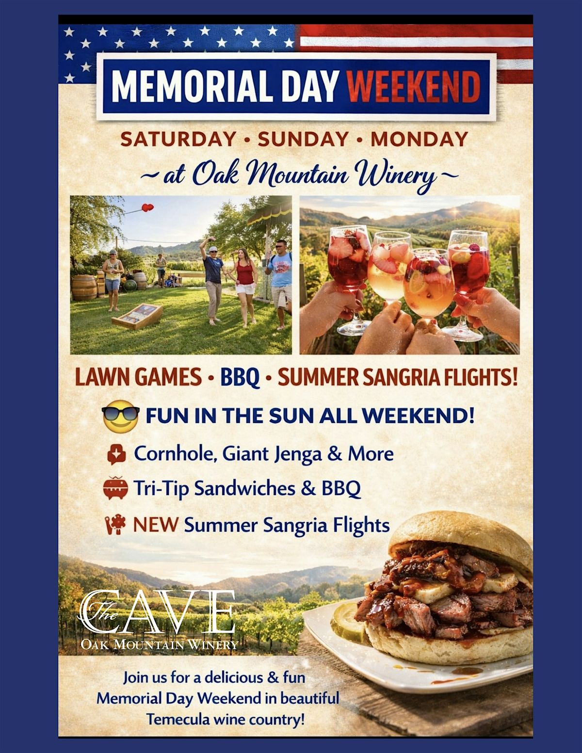 Join us for a Delicious & fun Memorial Day Weekend in beautiful Temecula Wine Country. Lawn Games, BBQ, Summer Sangria Flights