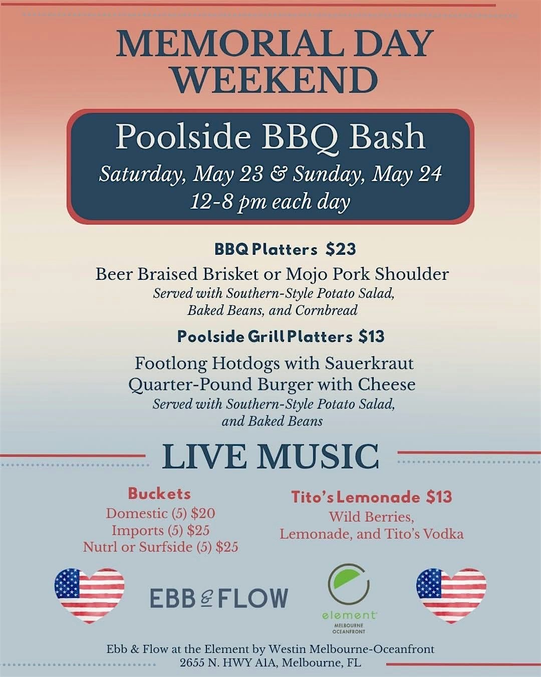 Join us for Memorial Day Weekend 🇺🇸 at Ebb & Flow on the rooftop of Element Melbourne Oceanfront🔥