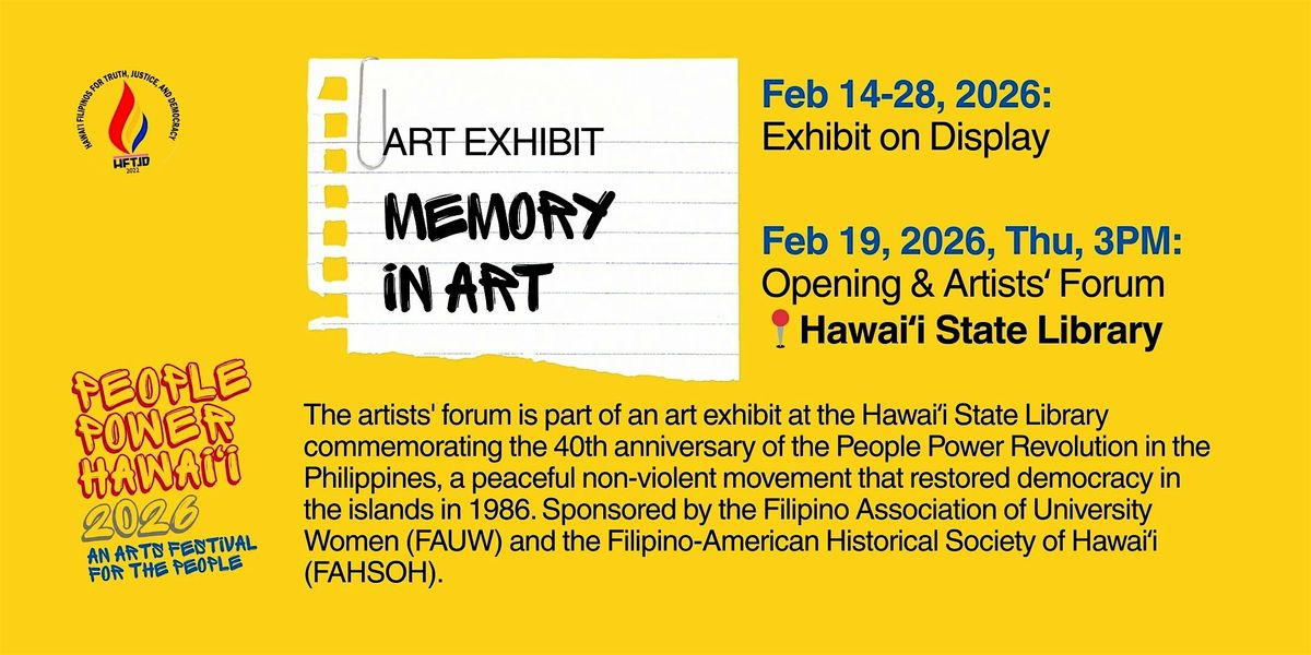 The artists' forum is part of an art exhibit at the Hawaii State Library commemorating the 40th anniversary of the People Power Revolution in the Philippines, a peaceful non-violent movement that restored democracy in the islands in 1986. The exhibit runs from February 14 to 28, and is part of the 2026 People Power Hawaii Arts Festival, sponsored by the Filipino Association of University Women (FAUW) and organized by the Hawaii Filipinos for Truth, Justice, & Democracy (HFTJD).