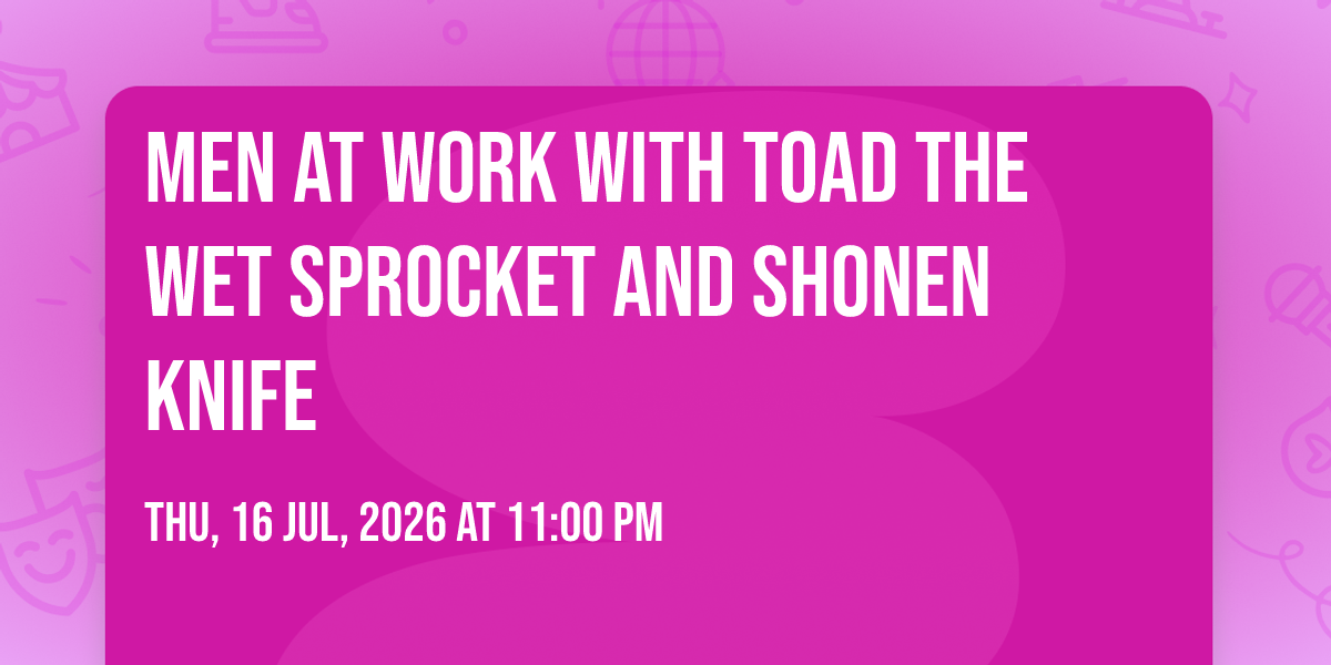 📍 Location: 26.2371, -80.1059✨ Enter a world of endless possibilities at Men At Work with Toad the Wet Sprocket and Shonen Knife, where every moment tells a story! 🏛️ The stunning Pompano Beach Amphitheater in vibrant Pompano Beach, FL transforms into a realm of wonder on July 16th, 2026 at 11:00 PM. 🌟 They have crafted an experience that goes beyond the ordinary, combining elements of surprise, delight, and pure entertainment. Every detail has been thoughtfully considered to ensure your journey with us is nothing short of extraordinary. 🎯 Join fellow adventure seekers and memory makers in this celebration of imagination and innovation. 🎊 Reserve your spot today and be part of something truly special!