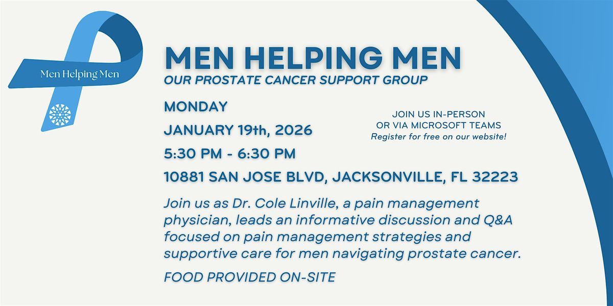 Men Helping Men is our educational program that empowers our prostate cancer patients to make informed decisions throughout their cancer treatment. Join us as Dr. Cole Linville, a pain management physician, leads an informative discussion and Q&A focused on pain management strategies and supportive care for men navigating prostate cancer.