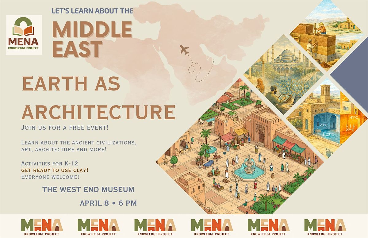 Join us at The West End Museum to learn about Middle Eastern Materials and Construction! Earth as Architecture explores Adobe, Rammed Earth, and Clay Construction for kids, followed by a hands-on clay activity! Everyone is welcome, and all ages can join in on the fun.