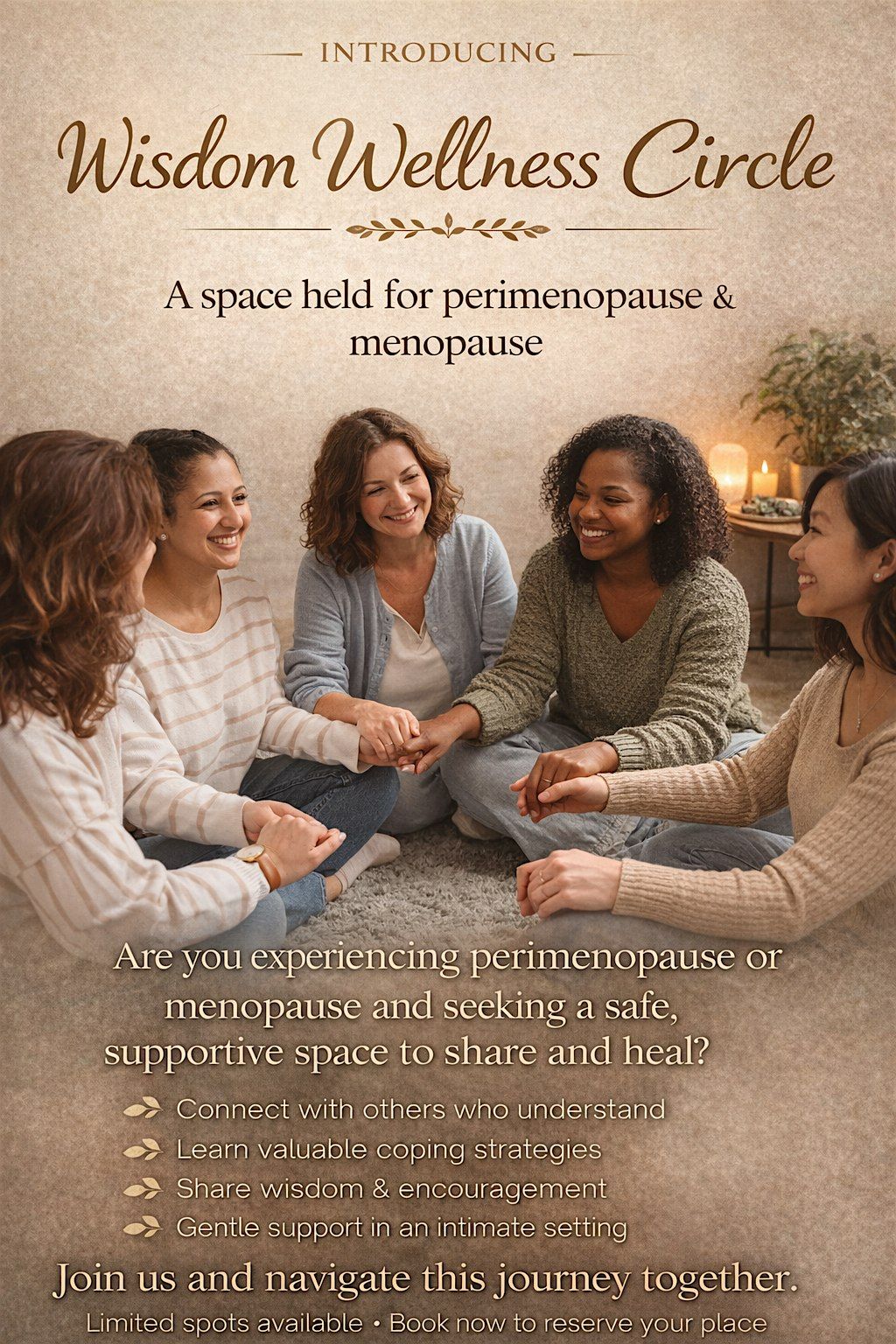 Join us for an uplifting in-person gathering where we celebrate the journey of menopause as a new beginning, not an end. This Wisdom Wellness circle is all about being in a safe, reflective and supportive environment. These circles offer a powerful opportunity to learn not only from your own inner process, but from the lived experiences and wisdom of others.