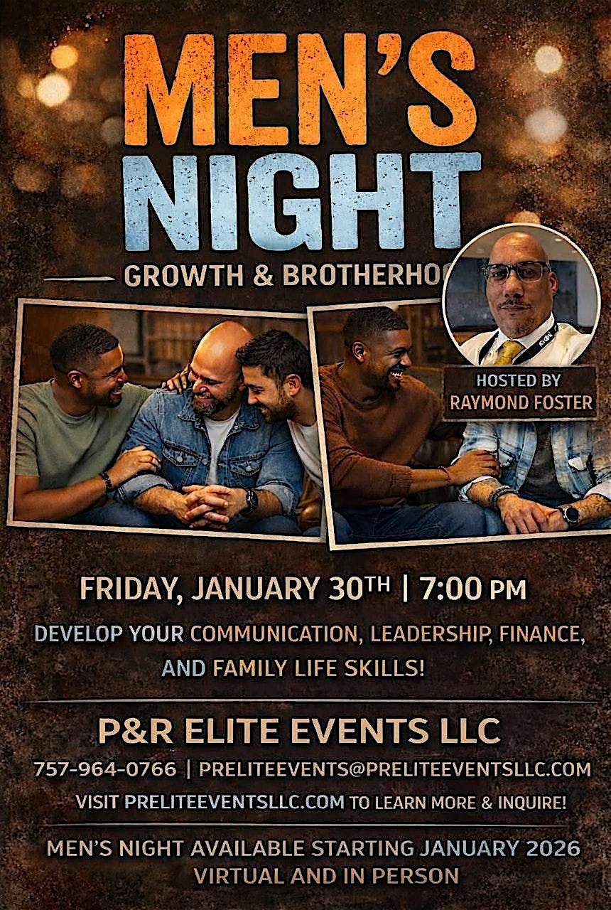 Welcome to Men's Night - Growth & Brotherhood! Join us at 4453 Bonney Rd on January 30, 2026 at 7:00 PM for an evening of connection and personal development. This event is all about fostering growth and building brotherhood among men.