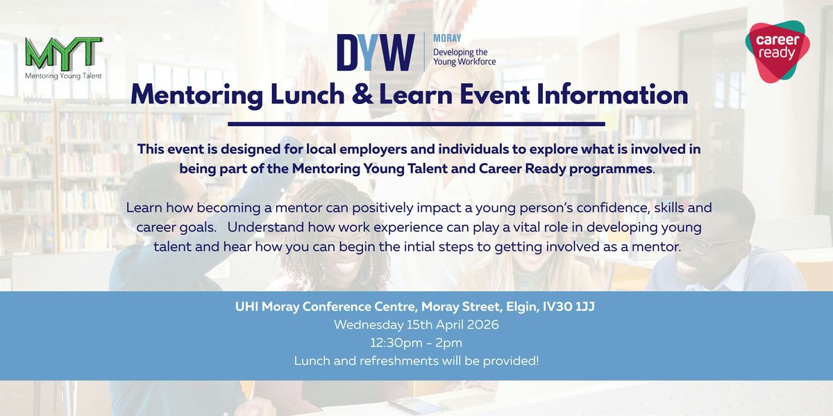 Join us over lunch at Moray College UHI from 12:30pm - 2pm, to learn more about the Mentoring Young Talent and Career Ready programmes.