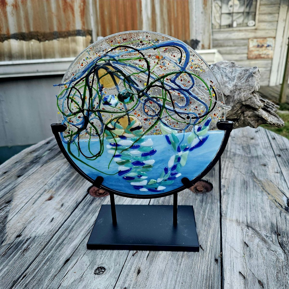 Mermaid hair, don't care! This mermaid has gone wild with our own curly whirley glass --called vitrigraph in the glass world -- made right here at HHGW. Style your own mermaid in fused glass with your choices of color and design. This class offers unique ways to use varied glass forms, from the abstract to traditional -- a great opportunity for newcomers and experiened glass aficionados alike. All are welcome! A metal stand is included to showcase your ocean beauty!