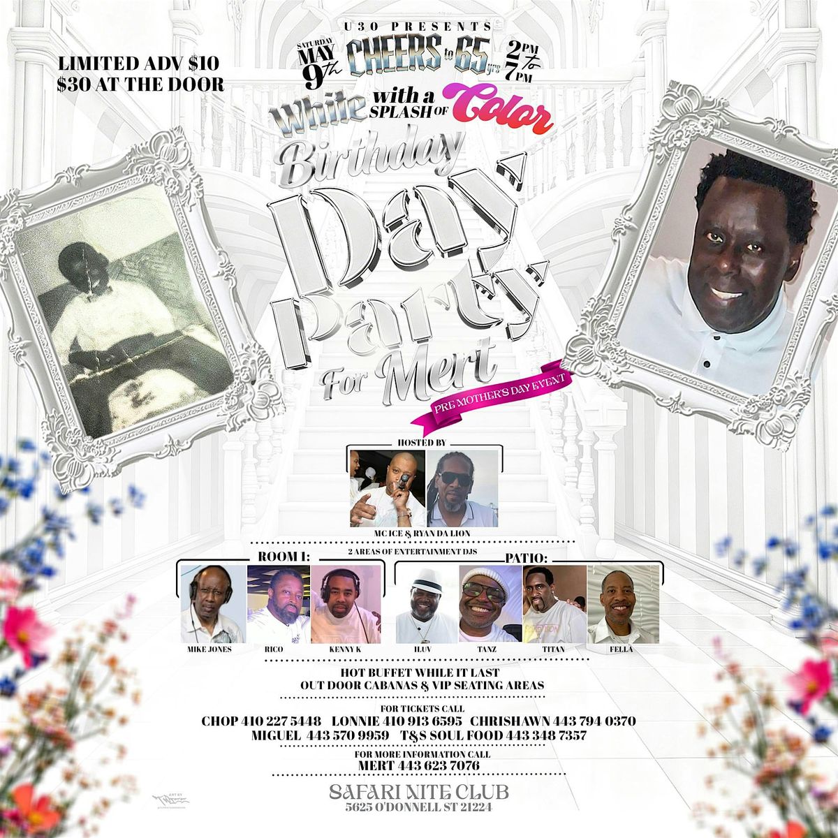 Join Mert U30 on Saturday May 9th 2pm - 7pm at Safari Night Club to celebrate his milestone 65th birthday & pre-mothers day event in "All White with a Splash of Color". Hosted by MC Ryan Da Lion & MC Ice. Soundtrack provided by: DJ Rico, DJ Kenny K, DJ Mike Jones, DJ Fella, DJ 1Luv, DJ Titan, & DJ Tanz. Advanced Tickets $10, $30 at the door. For VIP Indoor/Outdoor sections call 443.623.7076. Complimentary hot buffet while it last.