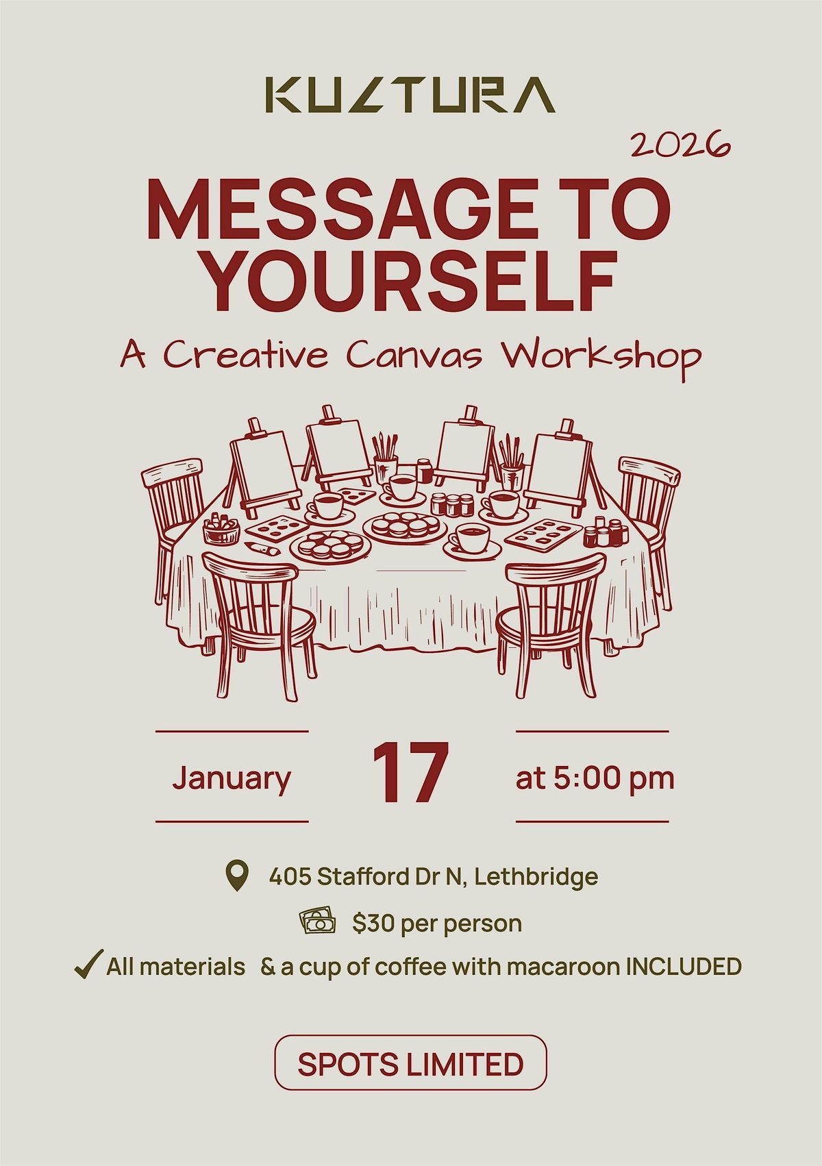 Start 2026 with intention and creativity. Message to Yourself is a cozy canvas painting workshop where you’ll reflect, create, and leave with a meaningful piece of art for your future self. No painting experience needed—just come as you are. All materials are provided, and your experience includes a cup of coffee and a macaron. A warm, inspiring evening designed to slow down, connect, and create. Spots are limited.