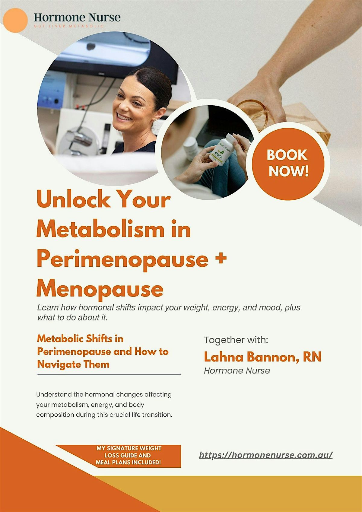 Come join us for an insightful session on understanding metabolic shifts during perimenopause and menopause. Our event will take place at the cozy venue located at level 2/234 Swanston St. Be prepared to learn about the changes your body undergoes during this phase of life. Save the date - March 26, 2026 at 12:30 PM (Australia/Melbourne)! Weight Loss Principles 68 page guide included as well as Q&A with Lahna