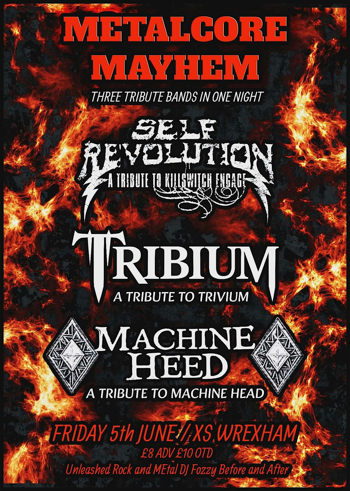 Metalcore mayhem is three tributes in one night! Self Revolution (Killswitch Engage), Tribium (Trivium), Machine Heed (Machine Head)