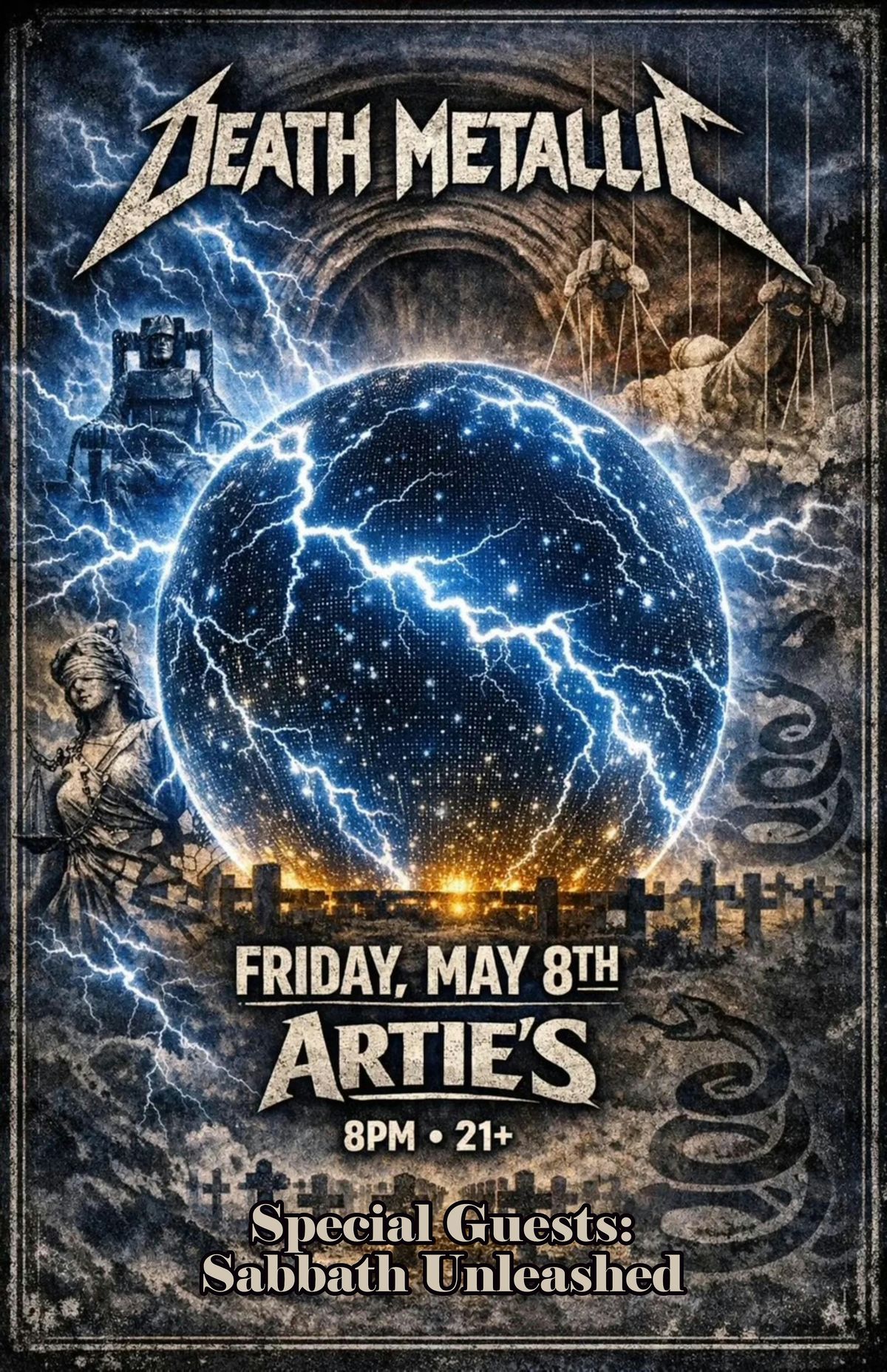Get ready to rock out at Arties Bar and Grill with an epic Metallica Tribute night! Join us for a night of headbanging to the tunes of one of the greatest metal bands of all time. The atmosphere will be electric, the drinks will be flowing, and the music will be loud. Don't miss out on this unforgettable event that will have you feeling like you're at a Metallica concert. Grab your friends and come rock with us! Special Guests Sabbath Unleashed