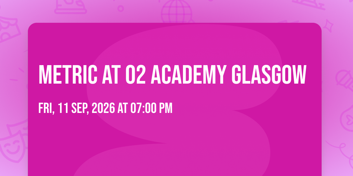 🌟 Be part of history at Metric at O2 Academy Glasgow, an extraordinary gathering that will captivate your imagination! 🏛️ The prestigious O2 Academy Glasgow in Glasgow, SC sets the stage for an unforgettable experience on September 11th, 2026 at 07:00 PM. ✨ They are bringing together the finest elements of entertainment and innovation to create moments that will take your breath away. From the moment you arrive, you'll be immersed in an atmosphere of wonder and excitement. 🎯 This carefully planned event ensures every guest experiences something truly special. 🎊 Early booking is recommended for this must-attend event of the season!