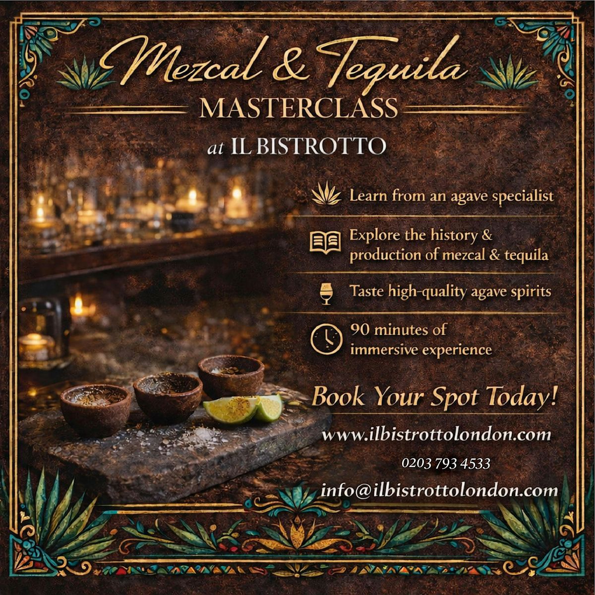 Designed to be both educational and relaxed, this masterclass offers a refined yet approachable exploration of agave spirits in an intimate setting.
