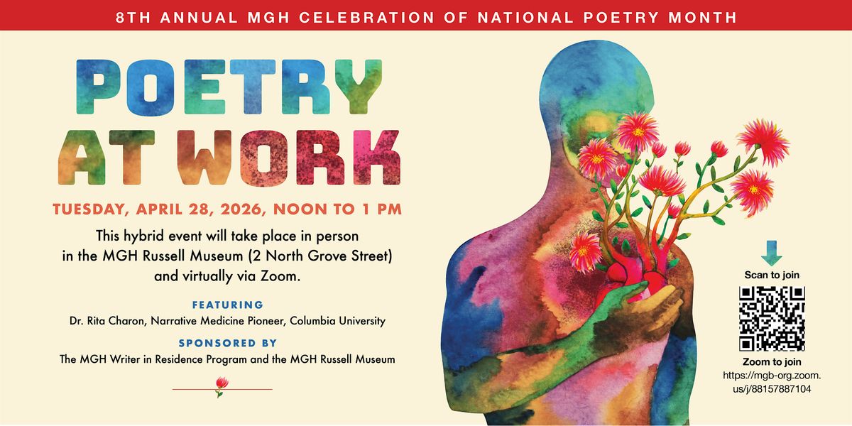 The eighth annual MGH celebration of National Poetry Month: Poetry at Work is co-sponsored by the MGH Writer-in-Residence Program and the MGH Russell Museum. This hybrid lecture will feature narrative medicine pioneer Dr. Rita Charon of Columbia University. Registration is not required.