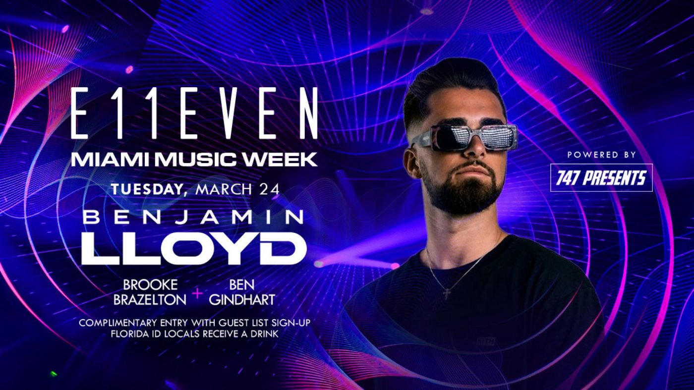 Miami Music Week at E11EVEN Tuesday, March 24 ft Benjamin Lloyd, Brooke Brazelton, Ben Gindhart. Complimentary Entry with Guest List Signup + FL locals receive a drink. Powered by 747 Presents.