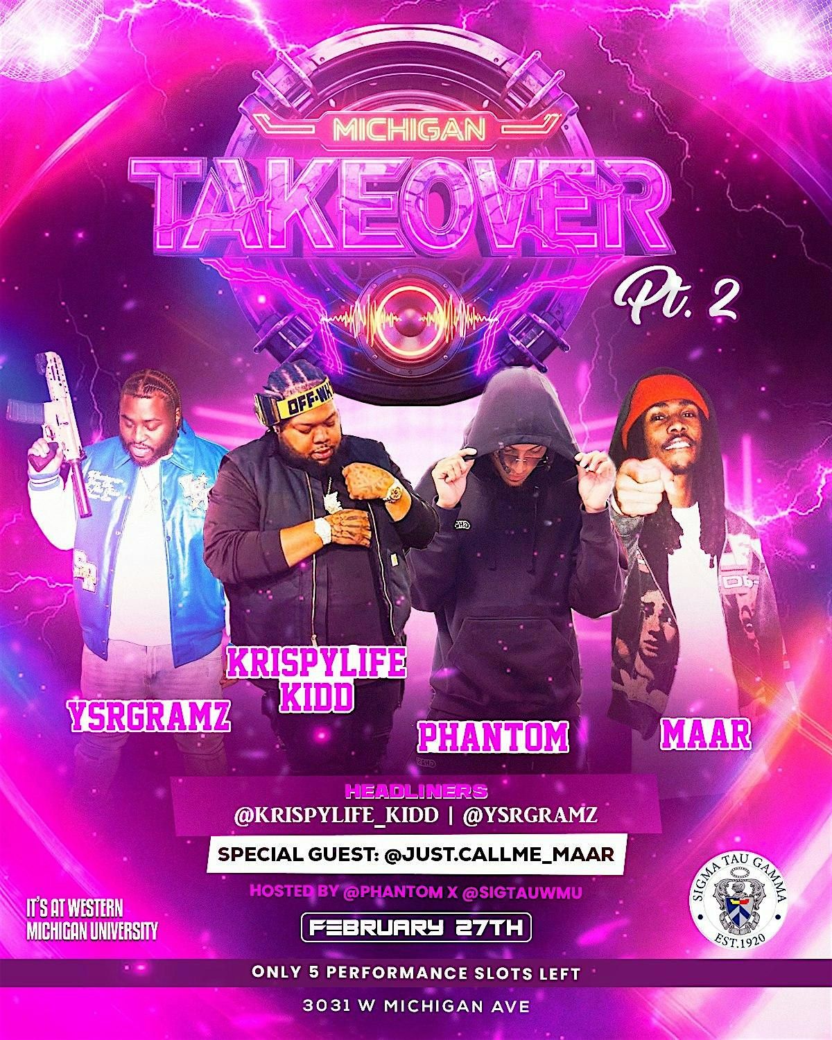In collaboration with Sigma Tau at Western Michigan University, this concert brings together college energy, Detroit influence, and Kalamazoo culture for a night of nonstop vibes, music, and unforgettable moments.