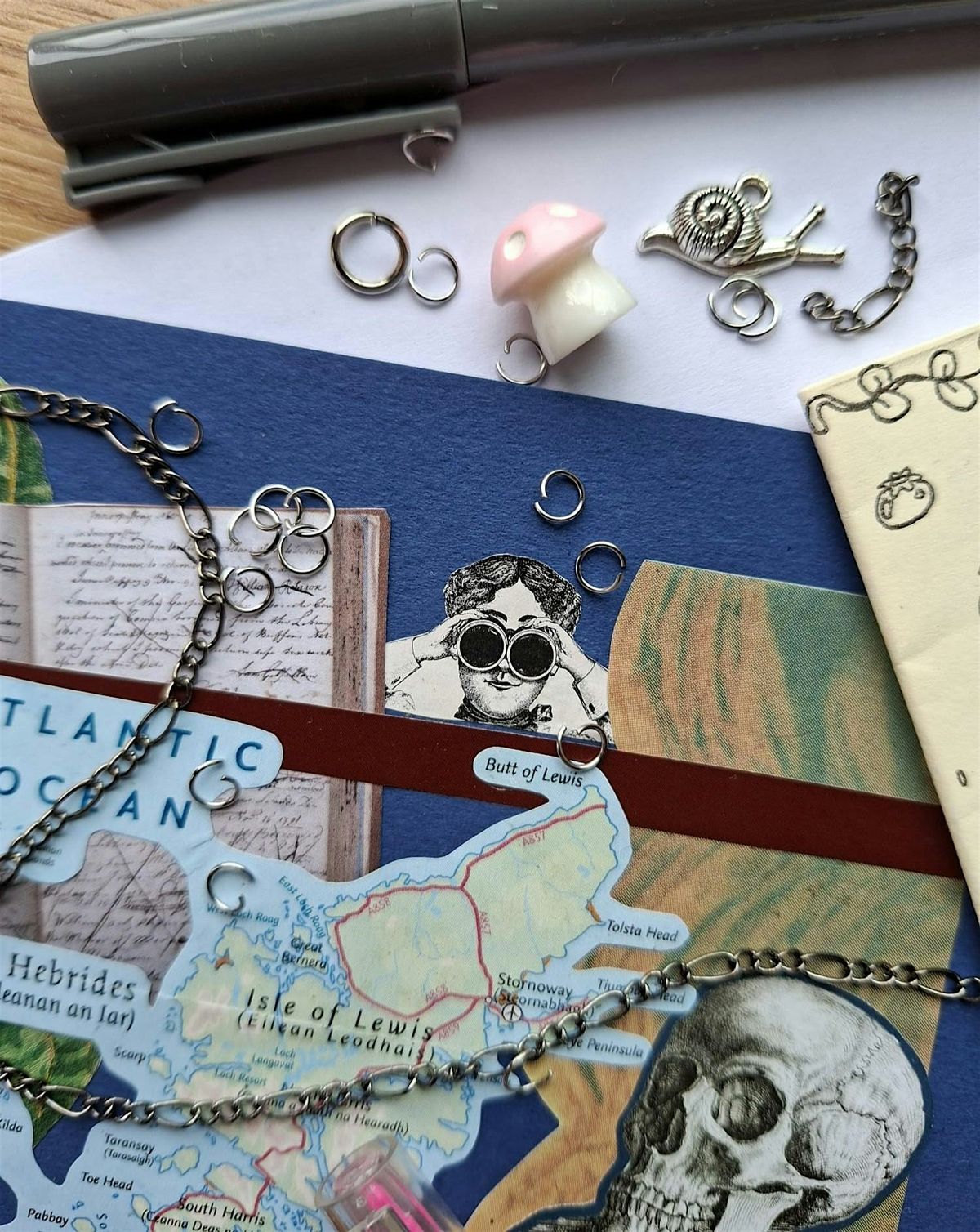 First we will make 2" square zines that fit snugly into little protective sleeves so that you can actually wear or carry them, rain or shine. There are a few different ways (be creative!) to attach them to gold-tone, silver-tone, or gunmetal grey chain, or a simple black cord necklace, or a few colours of reclaimed wool yarn. There are clasps if you want or need them as well as a selection of charms to add. Mix and match to your heart's content!