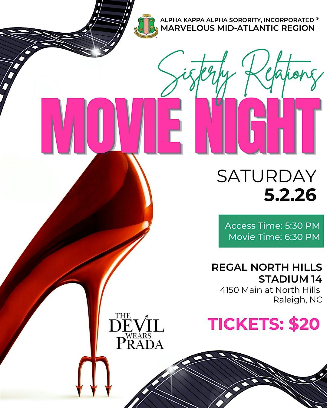 Join the members of Alpha Kappa Alpha Sorority, Inc.®️ to see The Devil Wears Prada 2! This event is open to the public. Tickets are non-refundable. Your purchase includes entry into the movie only; concessions can be purchased at the theater. Tickets are non-refundable. DOORS OPEN AT 5:30pm AND THE MOVIE STARTS AT 6:30pm. DRESS TO IMPRESS for this fabulous movie!