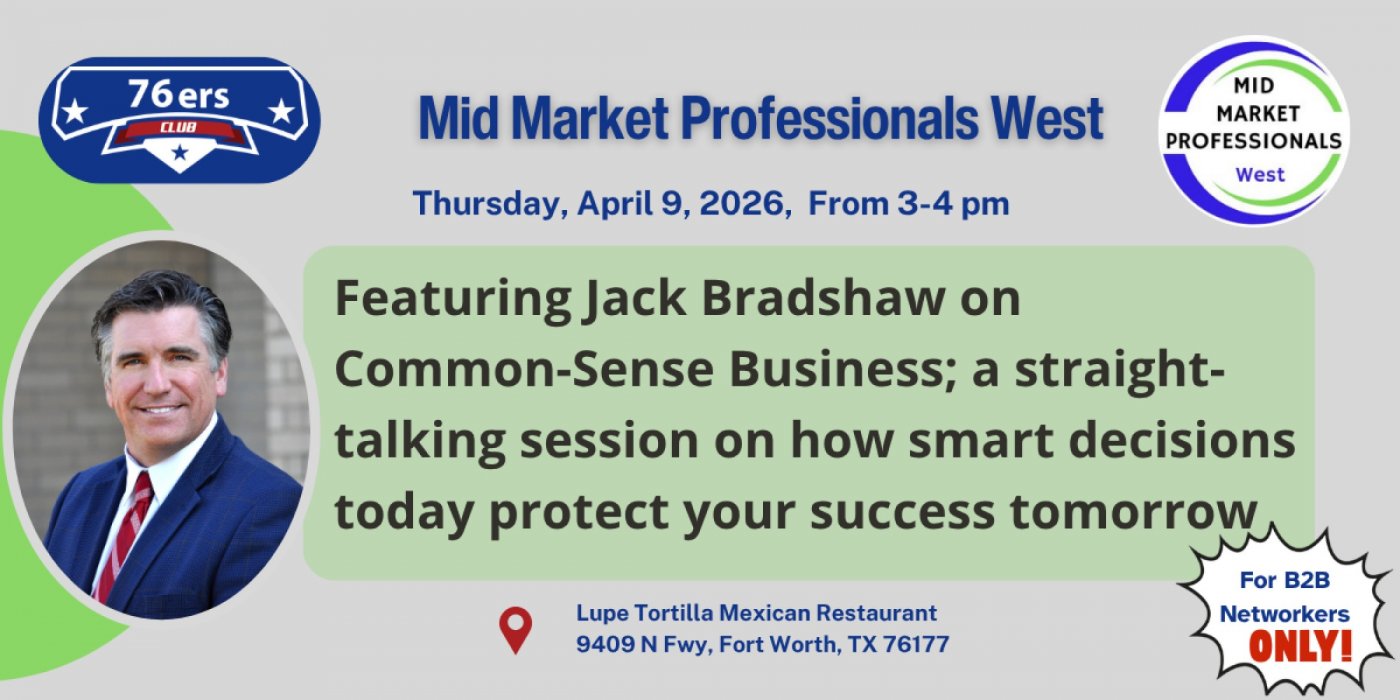 Growth is the goal — but not every big decision moves you forward. Join us Thursday, April 9th, as Mid Market Professionals West welcomes Jack Bradshaw, President & CEO of the North Tarrant Chamber, for Common-Sense Business — a straight-talking session on how smart decisions today protect your success tomorrow. Whether you're scaling up or steadying the ship, this one's worth showing up early for.
