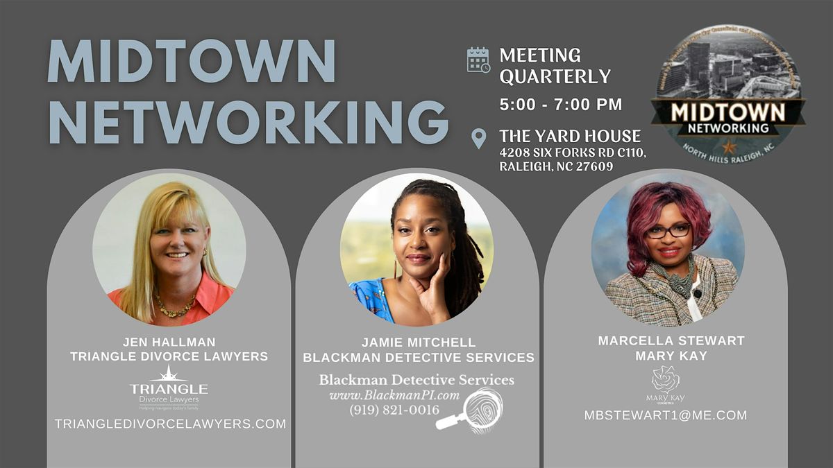 Keywords naturally included: Midtown Networking, Raleigh networking event, business networking Raleigh NC, in-person networking Raleigh, Six Forks Rd, Yard House Raleigh.