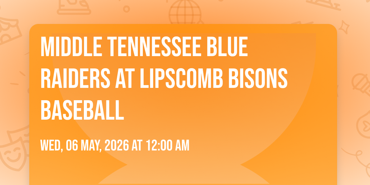 📍 Location: 36.1051, -86.7987✨ Embark on an extraordinary journey at Middle Tennessee Blue Raiders at Lipscomb Bisons Baseball, where every moment promises to be unforgettable! 🌟 Imagine of transforming Ken Dugan Field in the heart of Nashville, TN into a realm of endless possibilities. 📅 Join us on May 6th, 2026 at 12:00 AM for an experience that will challenge your imagination and exceed your expectations. 🎯 This carefully curated event combines the finest elements of entertainment, innovation, and community spirit. Whether you're an adventure seeker, culture enthusiast, or someone looking for unique experiences, this event offers something special for everyone. 🎊 Don't miss this chance to be part of something extraordinary!