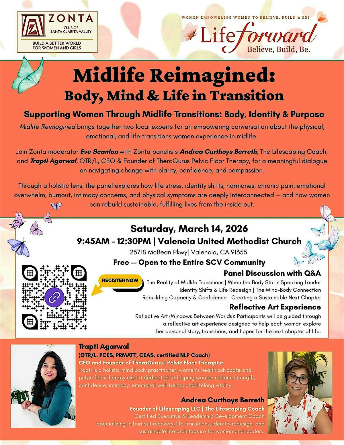 Join us in person to explore the exciting journey of midlife! This event is all about embracing changes and discovering new perspectives on your body, mind, and overall life. It's a relaxed space to connect, share, and get inspired as you navigate this unique phase. Ready to reimagine your next chapter? Come along and be part of the conversation! We have two empowering speakers Trapti Agarwal CEO & Founder of Thera Gurus, and Andrea Curthoys Berreth Founder of Lifescaping.