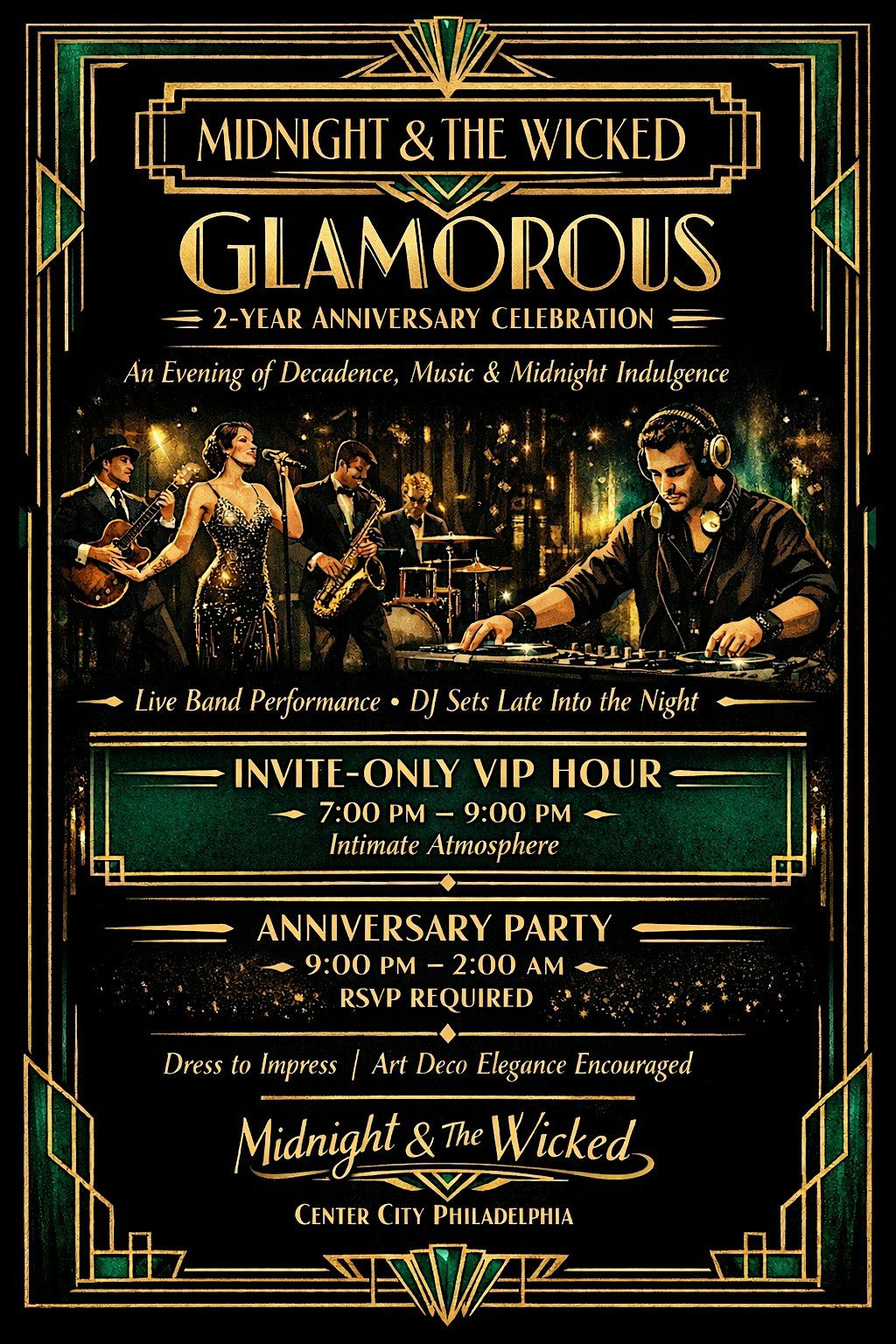 Join us as we mark two years of Midnight & The Wicked with an evening curated to move effortlessly from refined sophistication into full-scale celebration. The night begins with an invite-only VIP hour from 7–9PM, offering an intimate atmosphere to arrive, settle in, and experience the space at its most polished.
