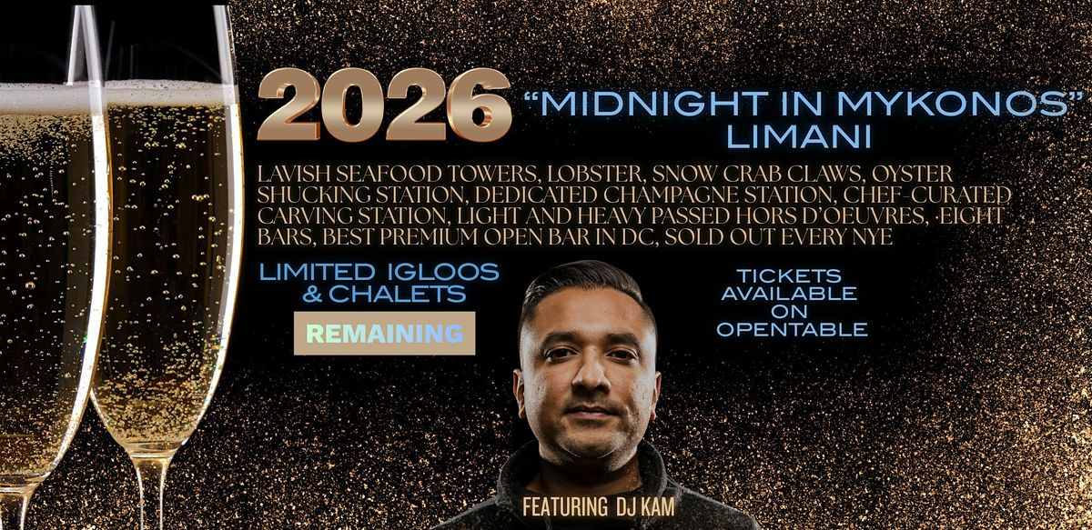 Midnight in Mykonos, New Year’s Eve 2026 at Limani at The Wharf returns with our annual glamorous, immersive waterfront celebration inspired by the elegance and nightlife of the Greek Isles, and it’s no secret that this event sells out early every year. Join us as we transform all three floors of Limani into DC’s most vibrant NYE destination, offering a premium open bar from 9 PM to 12:30 AM, lavish seafood towers featuring lobster, snow crab claws, and oysters, a live oyster shucking station, a dedicated champagne station, a new chef-curated carving station, light and heavy passed hors d’oeuvres, and a total of eight bars, including six new satellite bars for seamless service. Enjoy elevated ambience, photo booths, party swag, and a Mykonos-style midnight countdown while DJ Kam spins across all three floors, creating a dynamic, high-energy experience throughout the night. New for 2026, guests can indulge in expanded beverage offerings, upgraded culinary moments, and fully immersive entertainment. For those seeking an extra touch of luxury, VIP Igloos and Winter Chalets provide private, premium spaces perfect for groups and special celebrations. Dress to impress and ring in 2026 with style, energy, and Mediterranean magic, reserve your spot today.