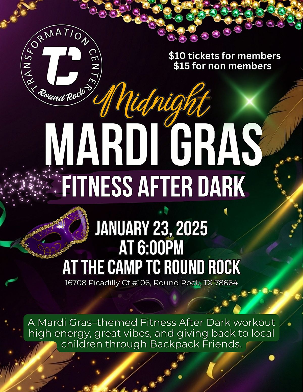 Join us for a high-energy Fitness After Dark event on Friday, January 23 from 6–9 PM. This special Mardi Gras–inspired workout party features a 90-minute bootcamp, a 60-minute Zumba session, and a LIVE DJ keeping the energy high all night.