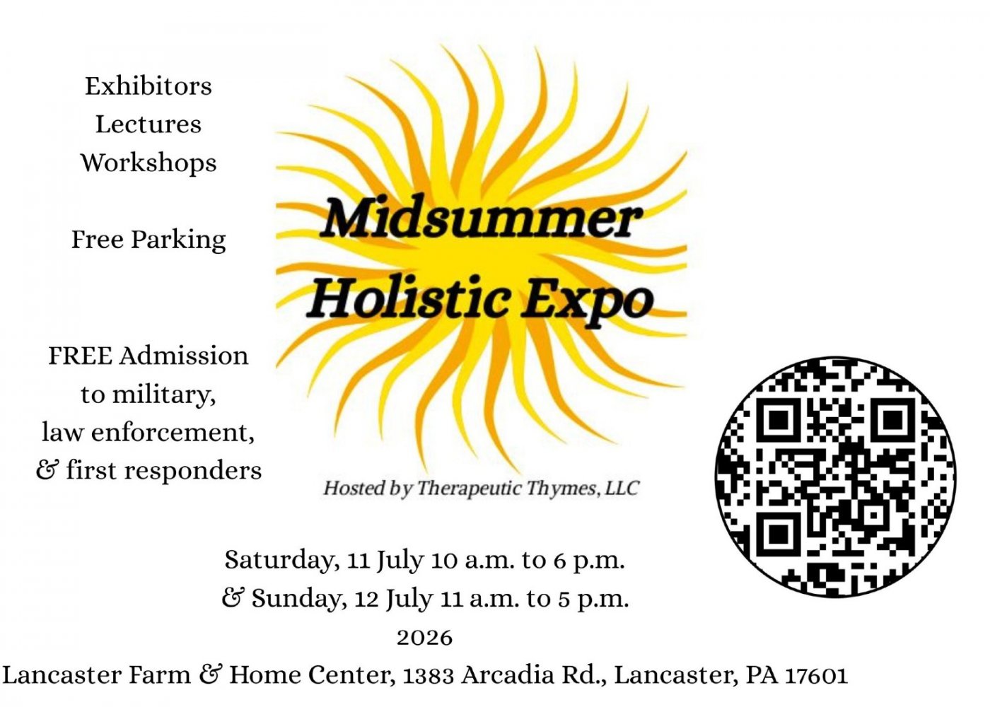 The annual Midsummer Holistic Expo, hosted by Therapeutic Thymes, will be held from 10 a.m. to 6 p.m., Saturday, 11 July, and 11 a.m. to 5 p.m., Sunday, 12 July, 2026, at the Lancaster Farm & Home Center. The Expo brings together vendors, speakers, healers, authors, crystals, reiki, readers, psychics, pendulums, jewelry, oils, herbs and other holistic items.Admission is $5 a day or free for military, law enforcement and first responders with ID. Location: 1383 Arcadia Rd., Lancaster. Tickets available at the door or thru Eventbrite.