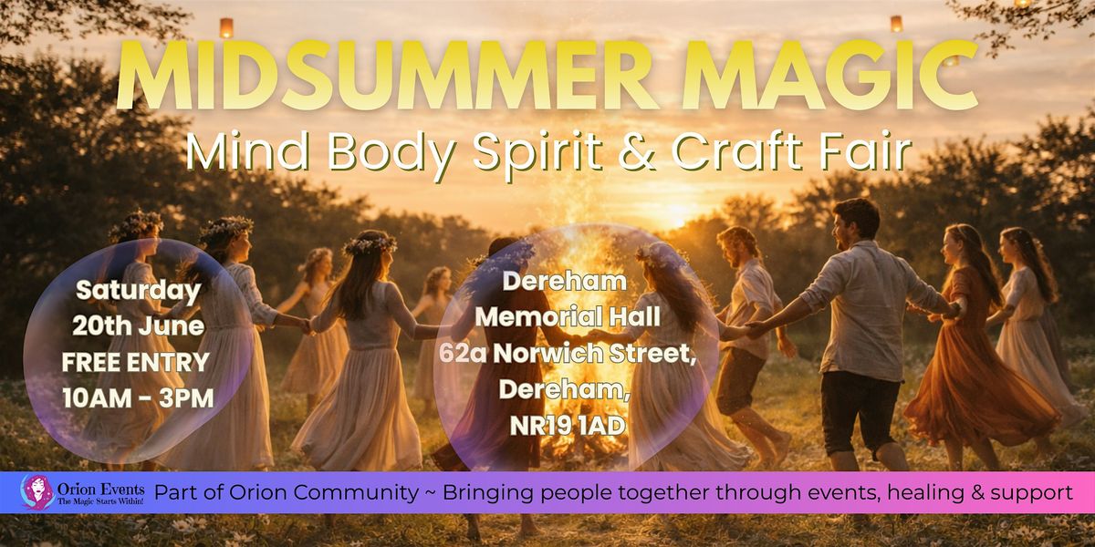 Join us on Friday 20th June at Dereham Memorial Hall for a day filled with uplifting energy, creativity, and heart-led experiences. Midsummer Magic is an invitation to pause, soak up the sunshine (inside and out), and reconnect with what lifts your spirit.